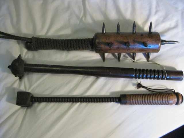 This club was made up of a leather handle, a flexible metal coil as the base, and a metal head. Various other heads, like smalls metals balls and star-shaped blades, were also affixed to clubs.