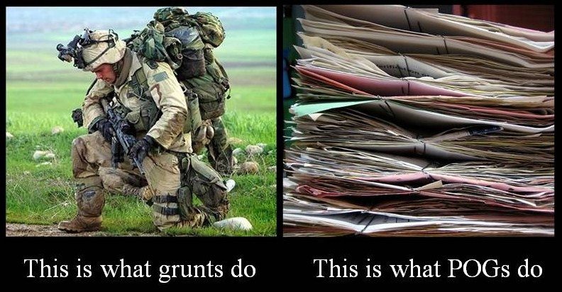 Grunts feel that POGs often just have an inferiority complex, which results in treating grunts like low-life scum (which isn’t totally wrong). Take pride in the fact that you help grunts bring the fight to the enemy! Grunts actually love cooks and motor-T because otherwise they’re stuck with MREs and long walks.