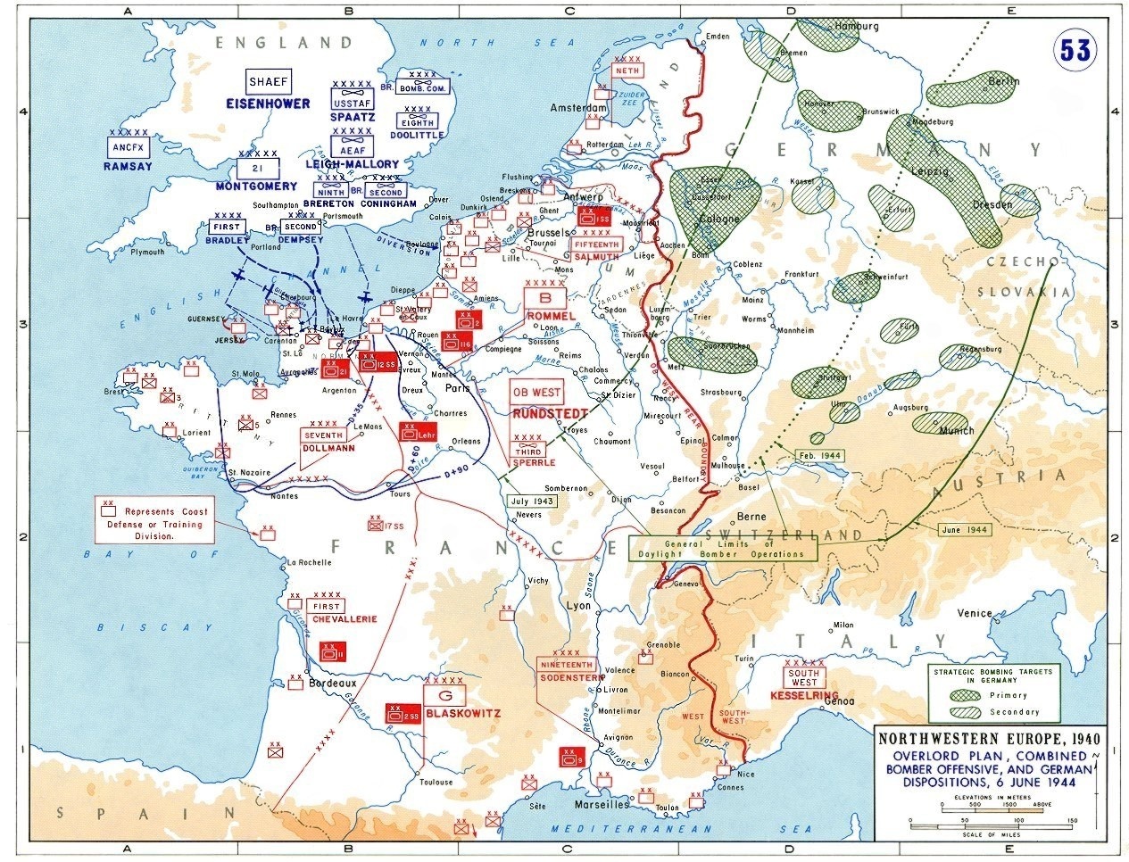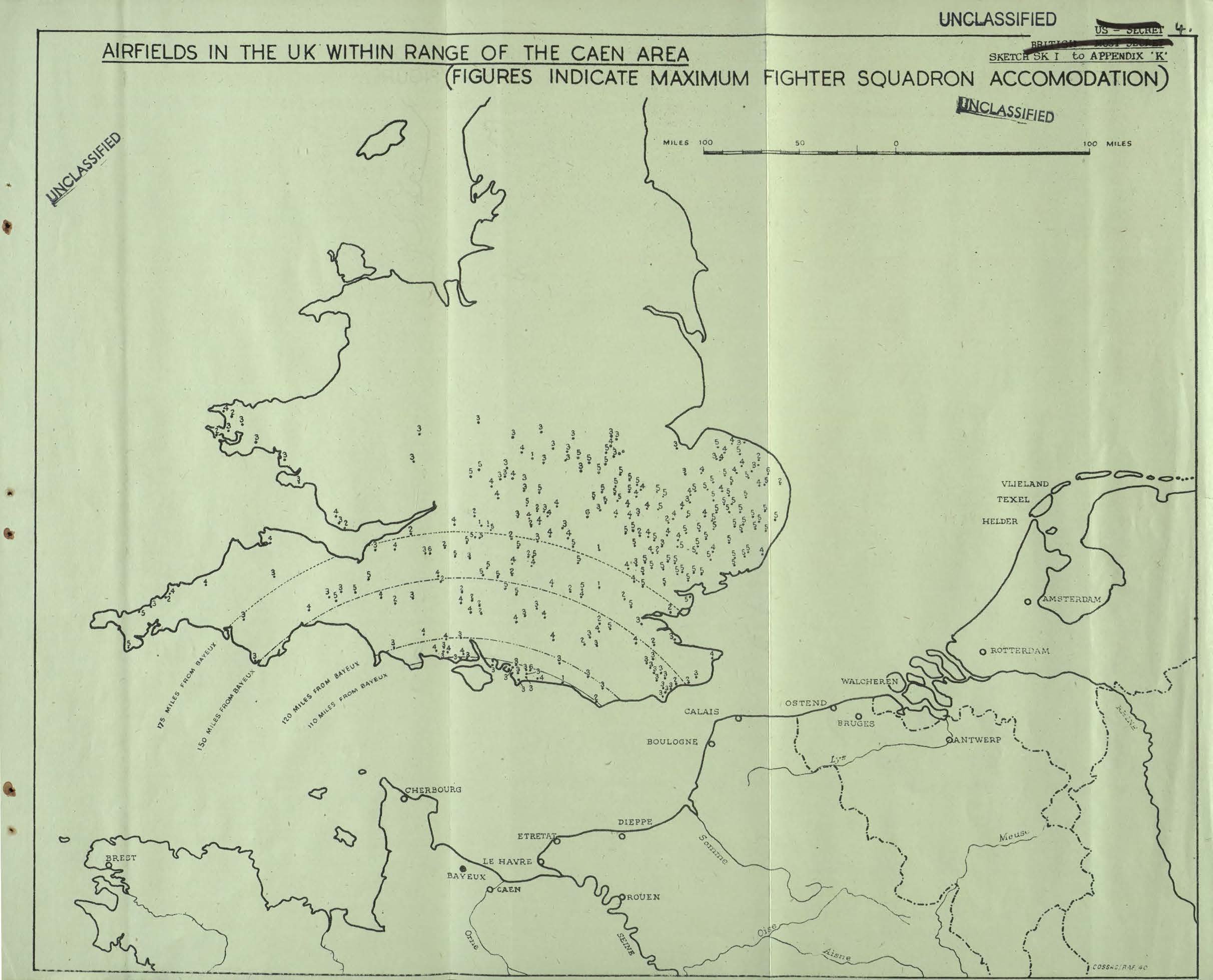 These fighter squadrons would escort the bombers over the channel and perform strafing missions against ground targets. Bayeux was a good single point to measure from, as nearly all troops would be landing within 30 miles of that city.