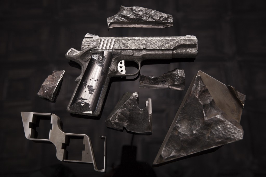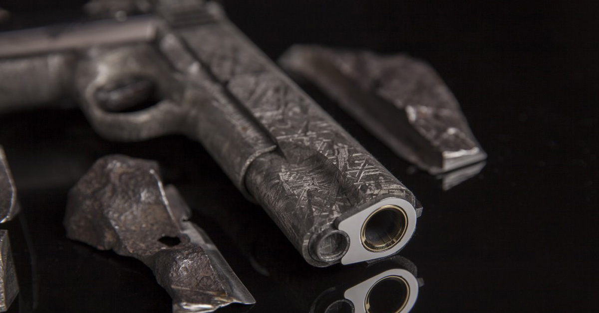 For just ,500,000, you can own a piece of geological history with the power to end someone else’s history. Crafted from a 77-pound piece of the extraterrestrial rock, from the barrel to its smaller moving parts, the set contains two of the one-of-a-kind firearms. They are both fully functional pieces, made completely from the meteorite and feature the space rock’s natural pattern on the finish.