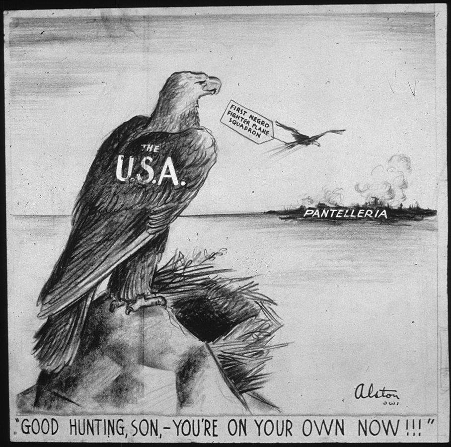 Office of War Information poster celebrating 99th Pursuit Squadron contributions to the victory at the island of Pantelleria.