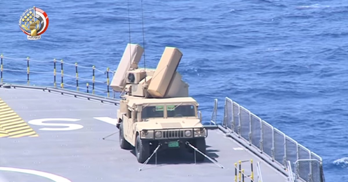 Scenes from the video show at least two AN/TWQ-1 Avenger air-defense vehicles — better known as the M1097 — tied down securely on the deck of one of the vessels, which have been named after Egyptian leaders Gamel Abdel Nasser and Anwar Sadat. The Humvee-based vehicles carry up to eight FIM-92 Stinger anti-air missiles and also have a M3P .50-caliber machine gun capable of firing up to 1200 rounds a minute.