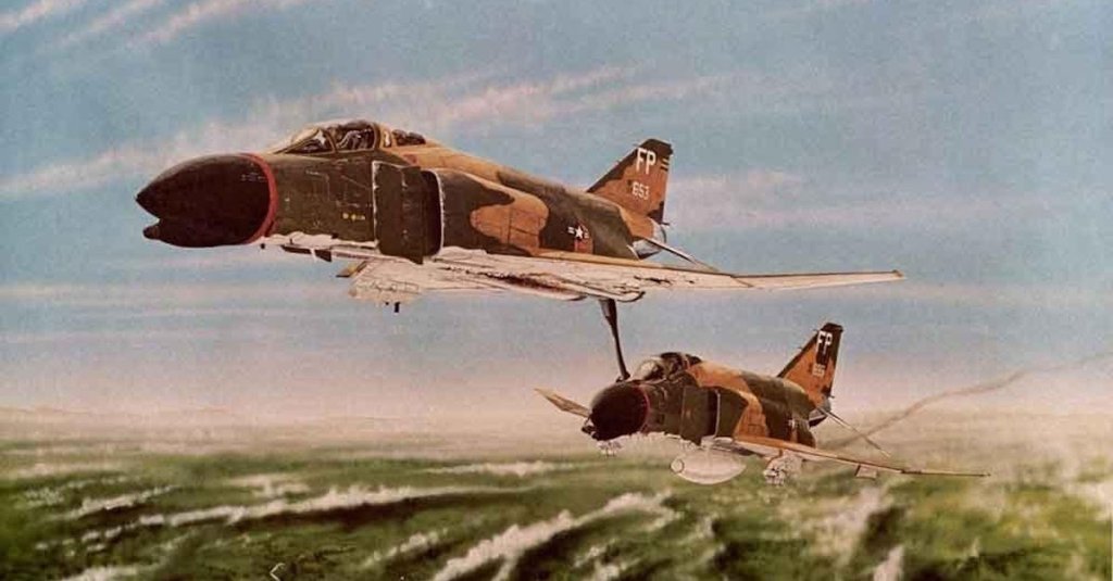 In 1967, Capt. Bob Pardo with Weapon System Officer 1st Lt. Steve Wayne and his wingman Capt. Earl Aman and his Weapon System Officer 1st Lt. Robert Houghton flew F-4 Phantom II fighter jets from Ubon Air Base in Thailand. On March 10, they were a part of a bombing run on a steel mill just north of Hanoi in North Vietnam. Heavy anti-aircraft fire cut through the skies, damaging both Phantom IIs. Aman and Houghton’s plane took a direct hit to the fuel tank and quickly lost most of their precious fuel. Without the range needed to make it to the KC-135 refueling tanker over Laos, Aman and Houghton would have to bail out over the unfriendly skies of North Vietnam. To prevent this, Pardo decided to push the stricken plane.