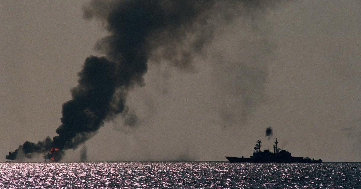 U.S. forces attacked and burned Iranian oil platforms after Iran fired a missile at a Kuwaiti tanker, hitting it and wounding dozens of sailors. The Navy determined the attack came from an otherwise-unoccupied oil platform, which they next surrounded, boarded, and destroyed – using both Navy SEALs and accurate fire from four destroyers as well as aircraft.