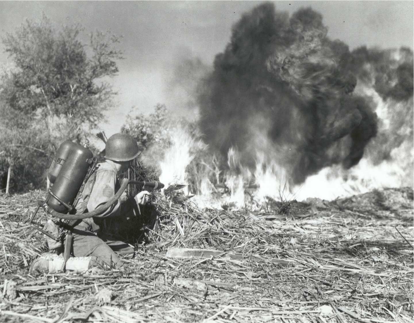 Traditional flamethrowers were backpack-mounted. The canisters on their backs were filled with what was, essentially, jellied gasoline. To make matters worse for the GI carrying a large, flammable target on their back, they had to get within 47 yards of the enemy to use a traditional flamethrower.