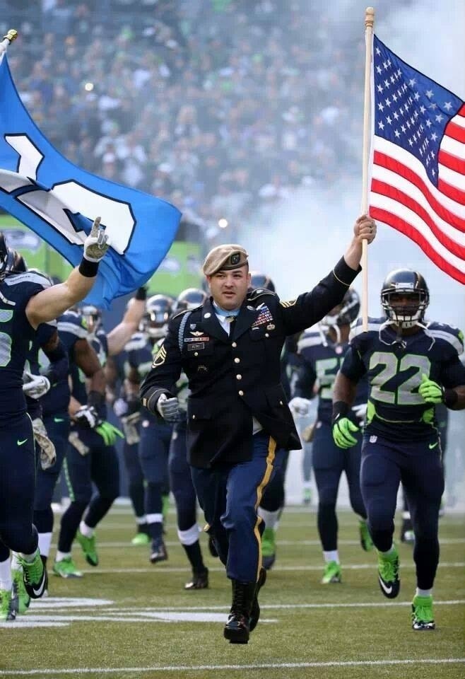 Medal of Honor Recipient Leroy Petry leads the Seattle Seahawks onto the field.