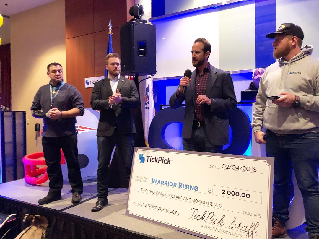 Jason Van Camp, Leroy Petry, and Flo Groberg (not pictured) accept a donation from TickPick on behalf of Warrior Rising at the Super Bowl in Minnesota.