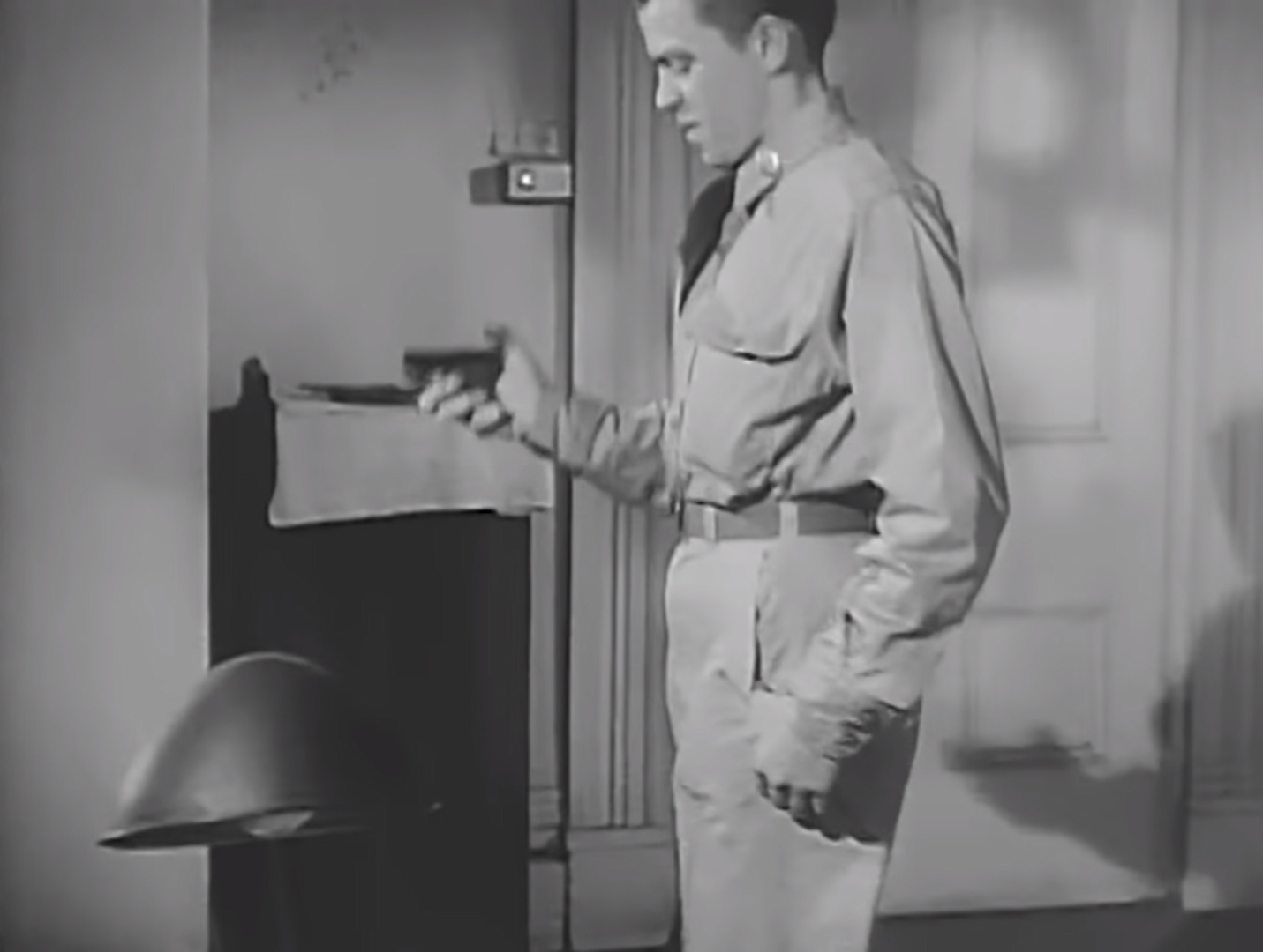 But even in ’50s propaganda, the MPs get into some blue falcon shenanigans, waking up a soldier waiting on a bus to get onto him about his uniform, then detaining a soldier on pass for looking slightly shady.