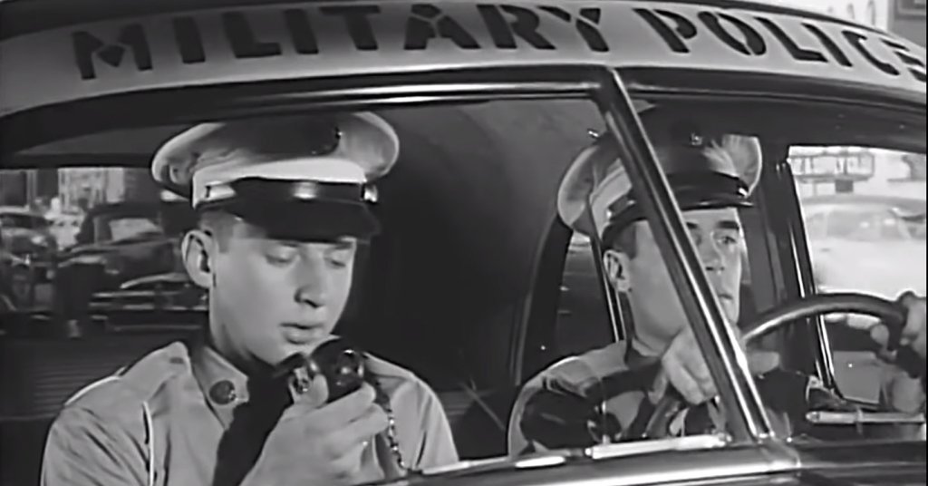 But even in ’50s propaganda, the MPs get into some blue falcon shenanigans, waking up a soldier waiting on a bus to get onto him about his uniform, then detaining a soldier on pass for looking slightly shady.