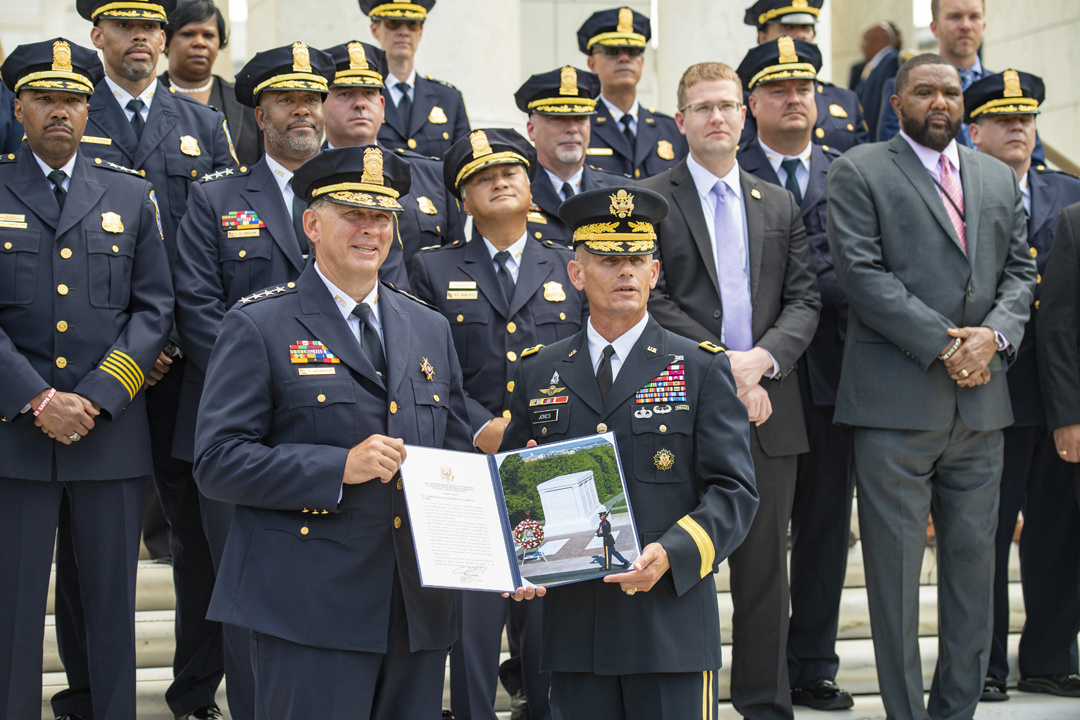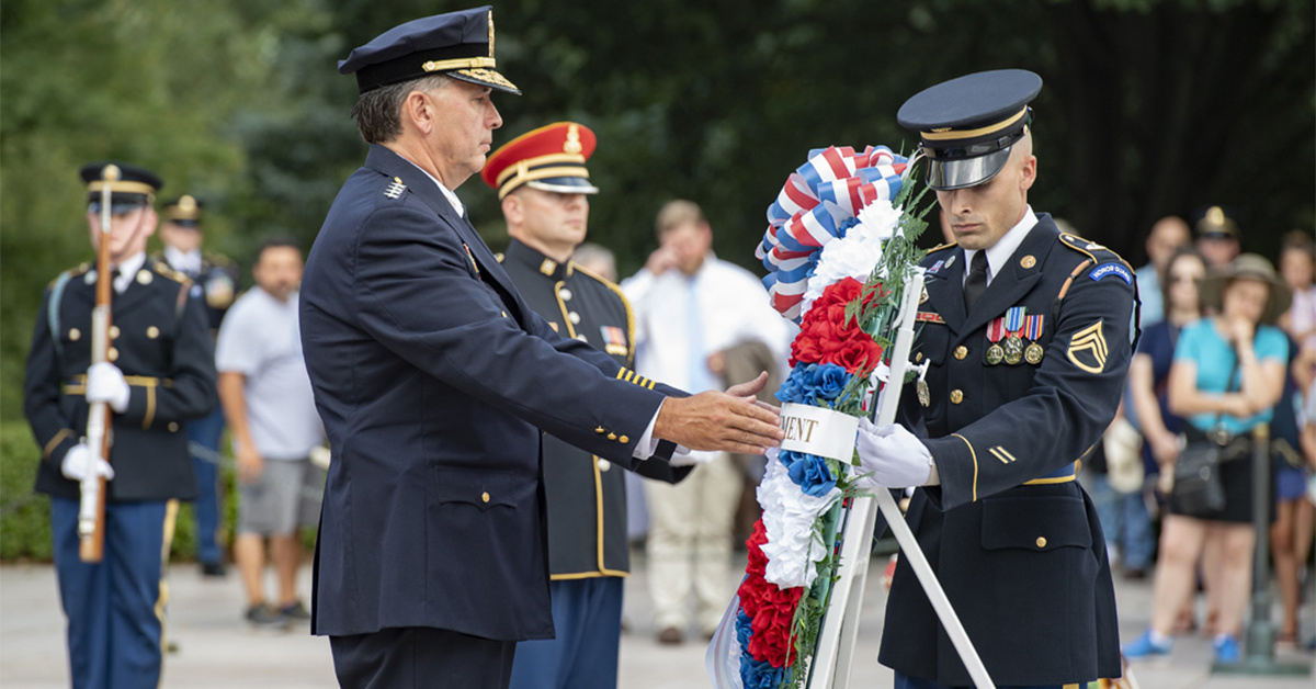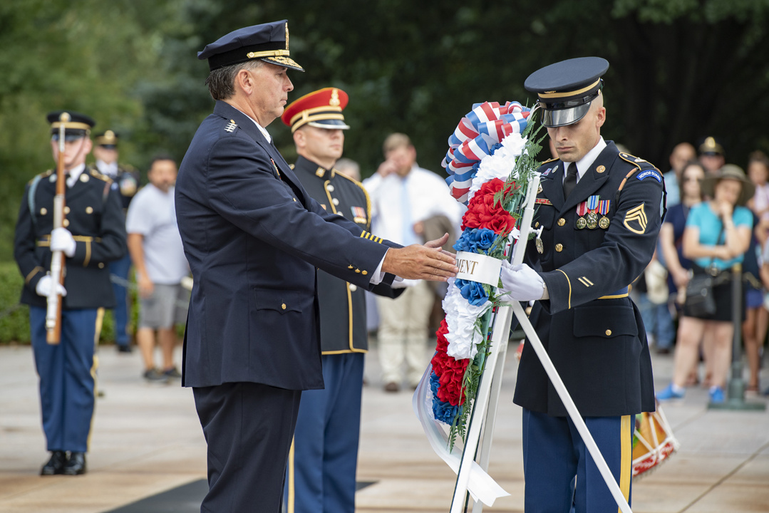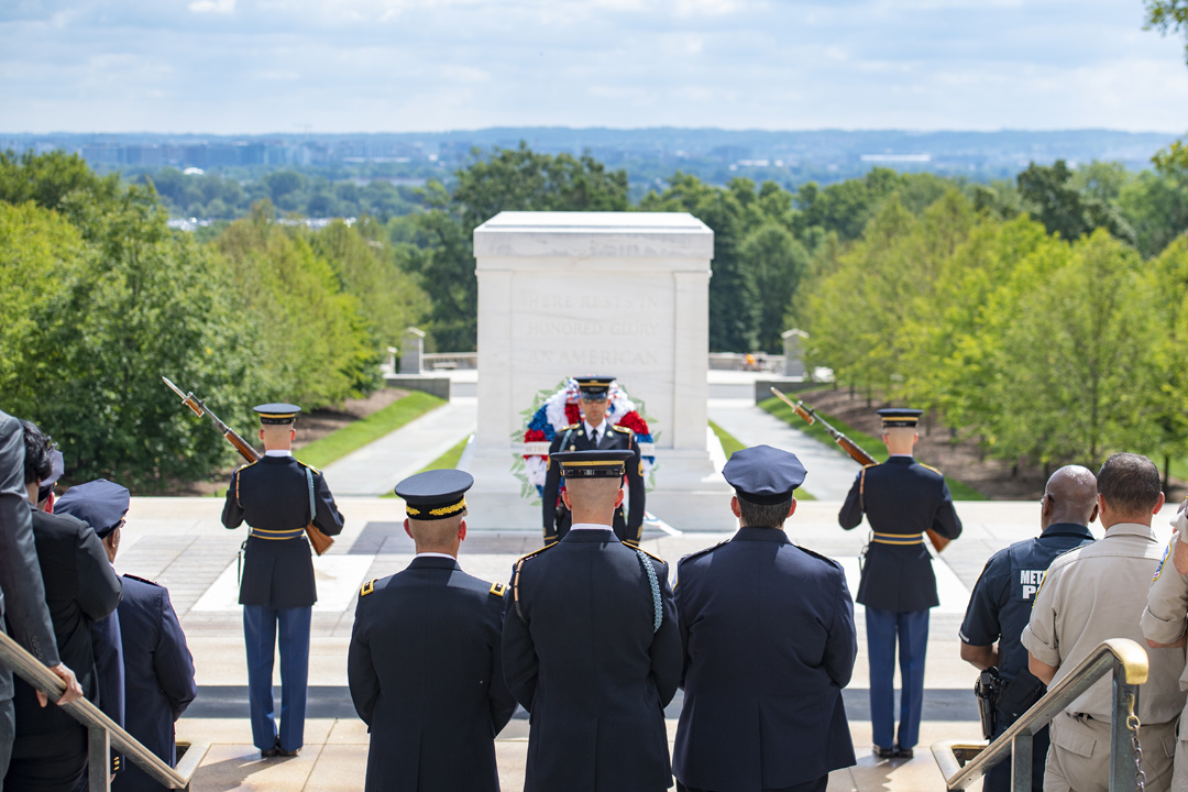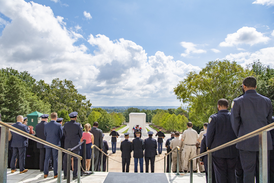 The chief of police of Washington D.C’s Metropolitan Police Department, Peter Newsham, visited the Tomb of the Unknown Soldier on Aug. 14, 2019 with many of his senior leaders and police officers and participated in a wreath-laying ceremony and other events, giving us a good chance to see how American and foreign dignitaries are allowed to show their respect for the tomb and all it represents. Here are 15 photos from that visit, all taken by Elizabeth Fraser, Arlington National Cemetery.