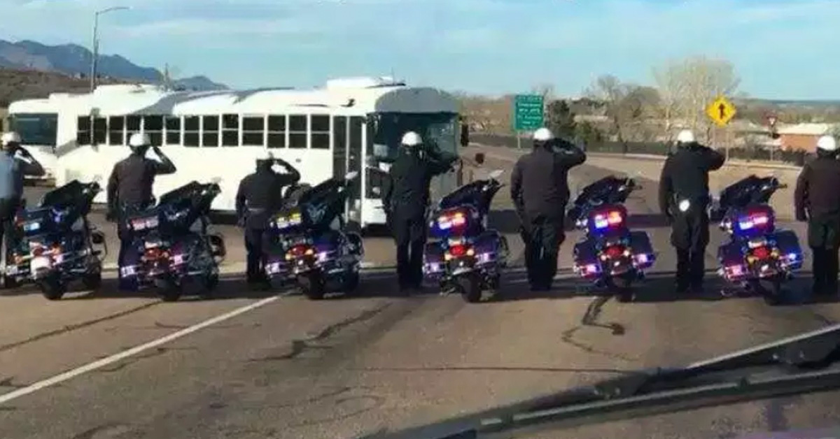 A line of police officers on motorcycles stopped their lives and their duties while in uniform to stand and render a sharp salute to buses full of soldiers returning home from Afghanistan. The Colorado Springs cops stood at attention next to their bikes, blocking oncoming traffic, as they saluted.