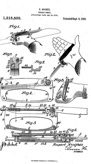 Finally, there’s the never-manufactured, but still-patented trench knife called the Hughes Trench Knife. Take all of the lethal features of previous designs and then turn it into a spring-loaded switchblade. You can see why it never made it past the design phase.