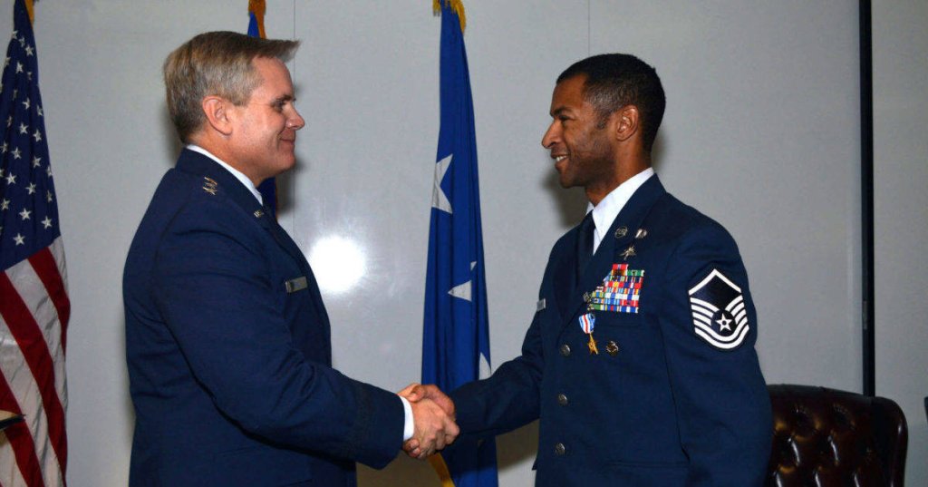 The airman hit the shooter two times with shots from his pistol and nine times with his M4, according to his award citation.
