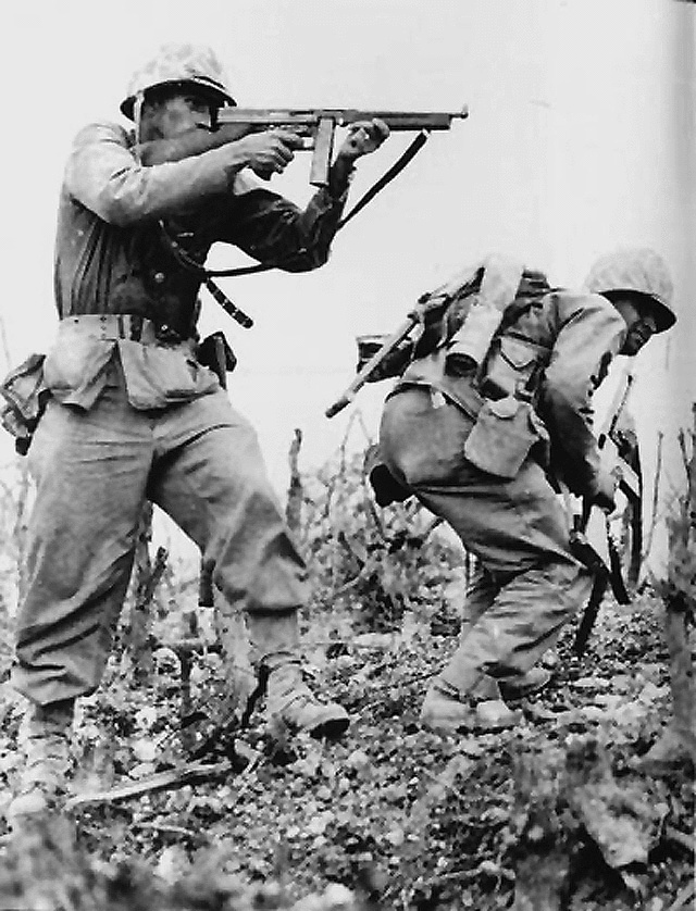 In nearly every photo of the era, the gangsters can be seen using the drum magazines, which provided them more ammunition for the weapon’s high rate of fire. It makes sense for an outlaw to use more ammo when trying to make a quick, clean getaway from the fuzz. Shouldn’t it make sense for U.S. troops to do the same when advancing in World War II?