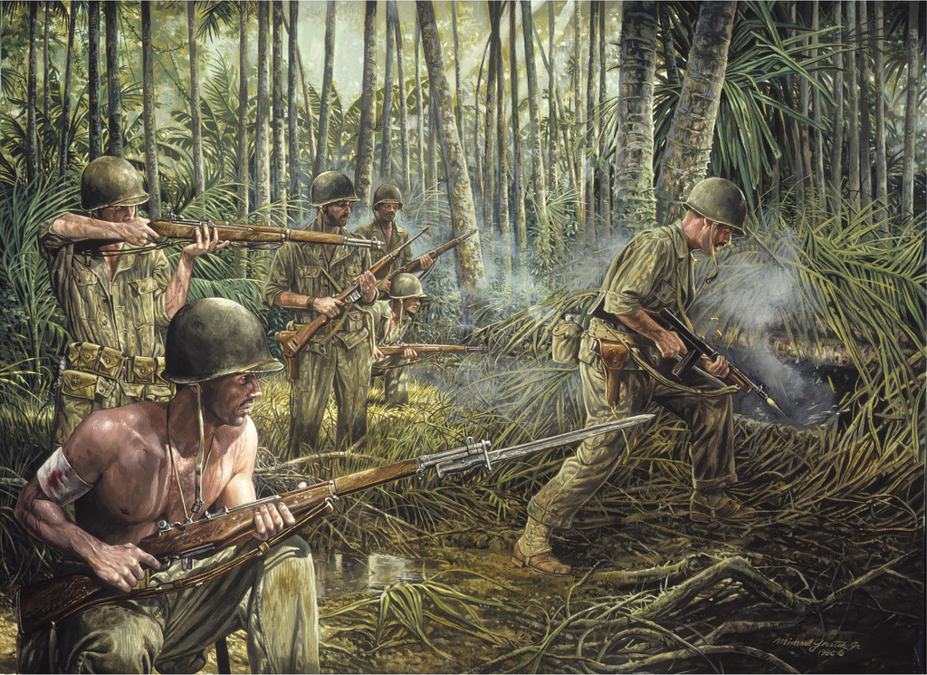 It was Army troops who first received the “Banzai” attacks against Henderson Field in late October, holding the Japanese back despite armor, artillery, air, and naval support pitted against the U.S. troops. On November 4, the soldiers took part in pushing 1,500 Japanese troops against the sea.