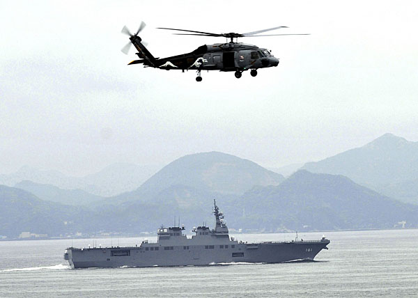 You can see a video of the Lancers doing a flyby of the three carriers and the Japanese “helicopter destroyer” below. The video was taken from a Navy helicopter orbiting the three-carrier formation.