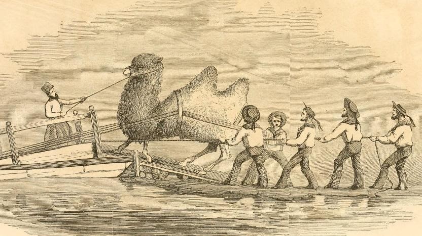 Supply picked up a herd of camels in North Africa, where it was discovered that she still could not accommodate the towering camel humps. In order to fit the camels in the hold, the crew had to cut away sections of the deck where the humps could stick out. Supply accomplished her mission, delivering the camels to Indianola, Texas in 1856. The camel cavalry concept was scrapped at the onset of the Civil War and Supply‘s service as a camel carrier ended.
