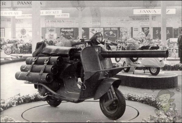 Representing motorbikes, the Vespa 150 TAP was an anti-tank scooter designed for use by French paratroopers. First introduced in 1956, the scooter was built by Ateliers de Construction de Motocycles et Automobiles, the licensed assembler of Vespa scooters in France. The scooters were equipped with a U.S.-made M20 75mm recoilless rifle, capable of penetrating 100mm of armor out to its maximum range of 3.9 miles.
