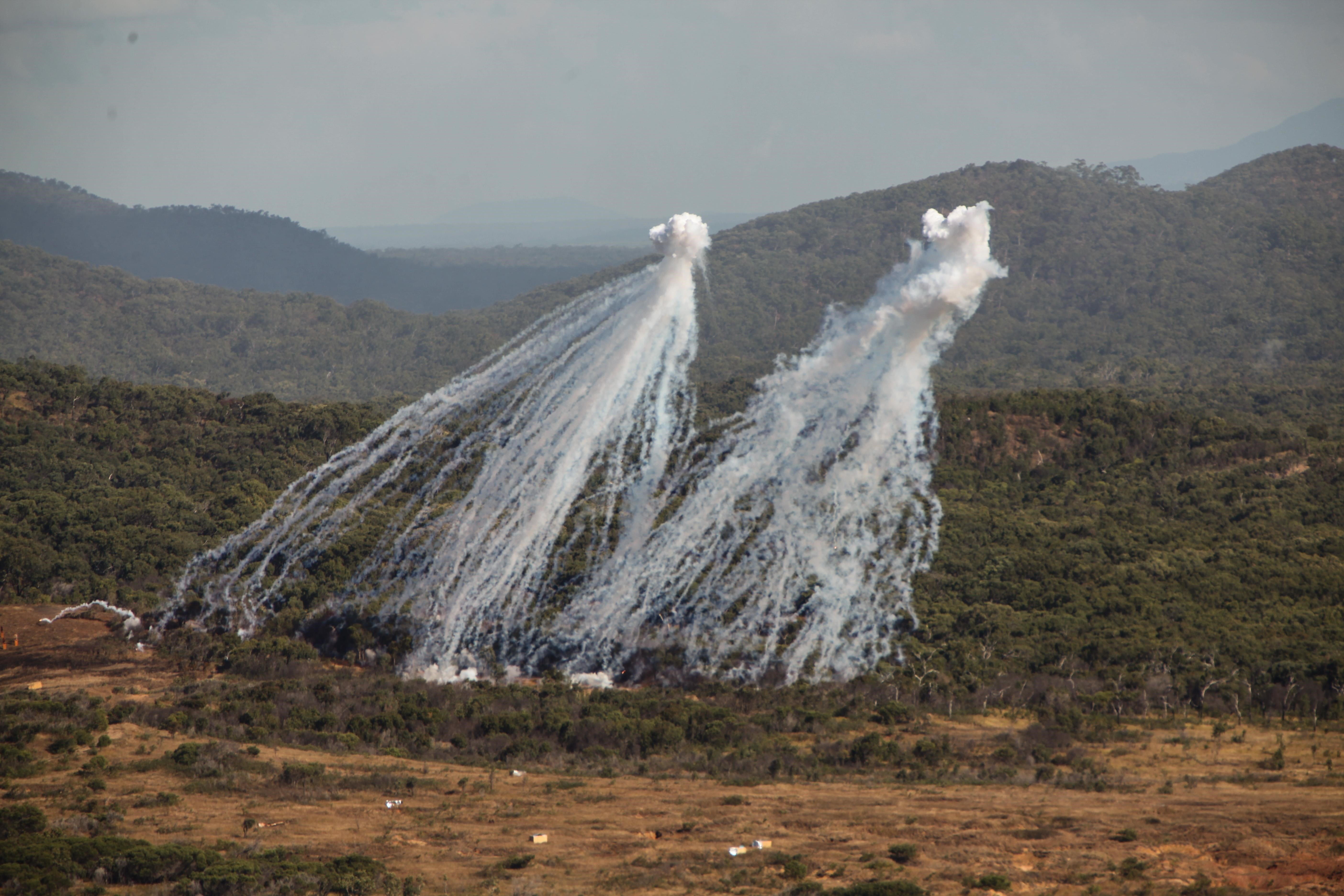 Once it’s burning, phosphorous emits clouds of thick smoke. For infantry and other maneuver troops attacking an enemy position, that means phosphorous smoke can block the view of defenders trying to kill them. This use of phosphorous is completely legal. It can also be used to mark enemy positions which, again, is completely legal.