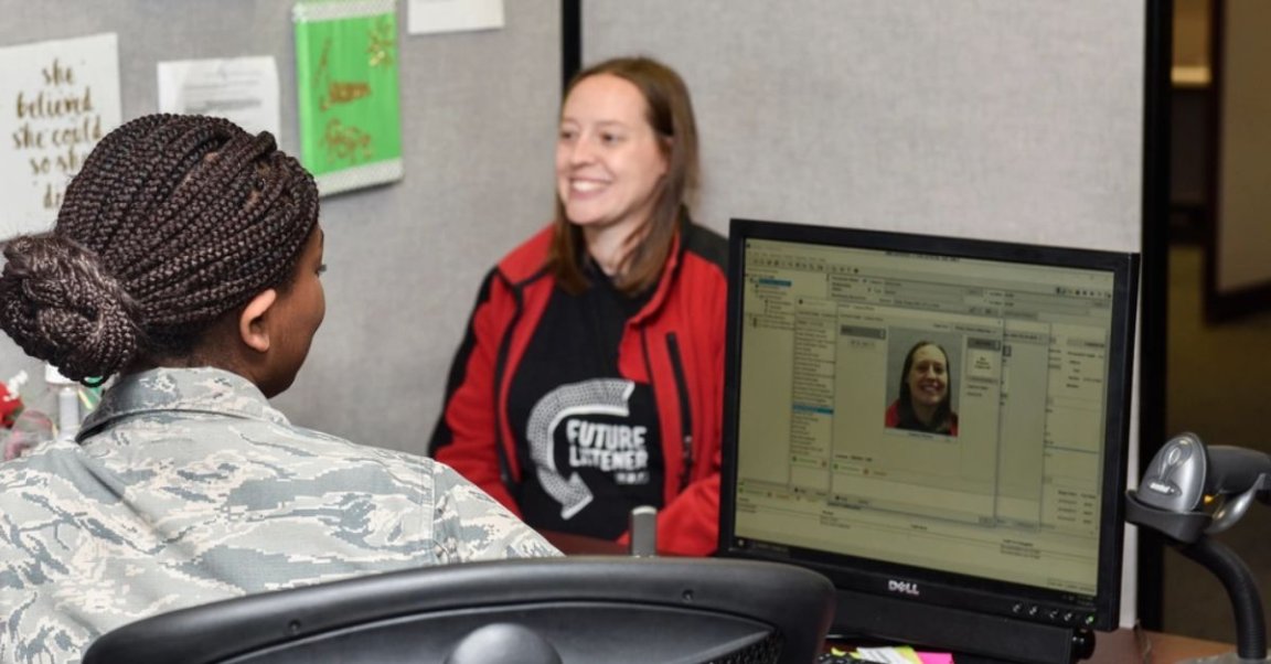 Dr. Nan Pond gets her picture taken for a new ID by Airman 1st Class Jacara Pope, 377th FSS customer service technician, at Kirtland Air Force Base, N.M., Jan. 15, 2019. Kirtland’s MPF work also includes making ID cards for service members, contractors, dependents and retirees, DEERS updates such as new dependencies and marriages, leave approval, line of duty determinations, special leave accrual, on base transportation, resetting common access cards and helping dependents gain U.S. citizenship. (U.S. Air Force photo by Airman 1st Class Austin J. Prisbrey)