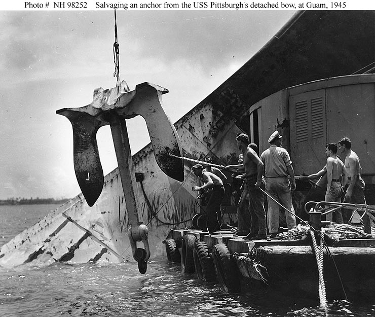 The separate 104-foot bow section was nicknamed McKeesport, a suburb of Pittsburgh, and was retrieved by the tugboat USS Munsee (ATF-107). With thousands of miles separating the ship’s bow and stern, Pittsburgh was nicknamed “The Longest Ship in the World.” The breakage was attributed to poor welding at the Bethlehem Shipbuilding Co. In Guam, Pittsburgh was fitted with a false bow and continued on to Puget Sound Navy Yard, Washington, for repairs. The ship was still undergoing work when the war ended.