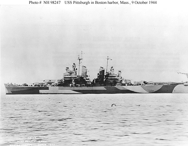 USS Pittsburgh (CA-72) was launched on February 22, 1944, at the Bethlehem Shipbuilding Co. in Quincy, Massachusetts. The ship was commissioned on October 10 of that year and ordered to the Pacific Theater. Pittsburgh joined Fast Carrier Task Force 58 with the carrier USS Lexington (CV-16) and sailed for Iwo Jima on February 10, 1945. In support of the invasion, Pittsburgh shelled airfields and other Japanese military installations on the island of Kyushu. During the invasion of Okinawa, from late March to late April, Pittsburgh guarded the vital aircraft carriers against enemy air attack and launched her scout planes to rescue American pilots who were shot down over the water.