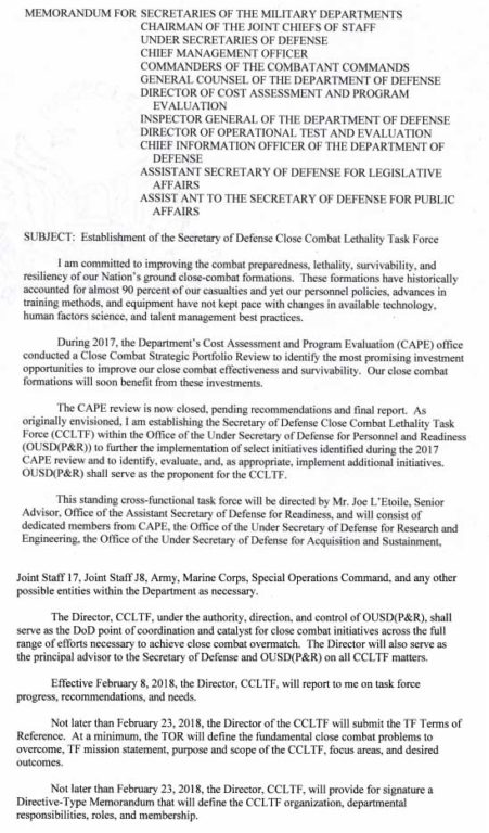 On Feb. 8, Defense Secretary James Mattis, probably everyone’s favorite human Marine, sent a memo (below) to top Department of Defense officials regarding the establishment of a Close Combat Lethality Task Force, which will improve “the combat preparedness, lethality, survivability, and resiliency of our Nation’s ground close-combat formations.”