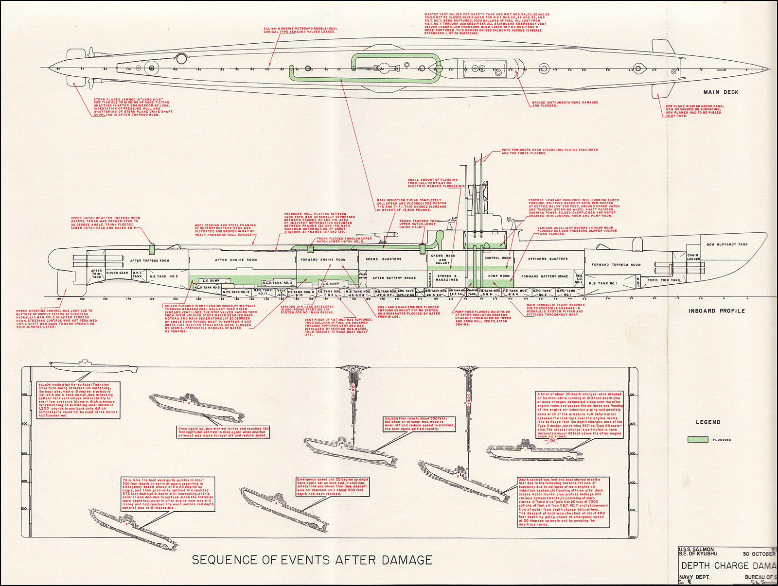 The escorts fired four spreads of depth charges at Salmon. The first two spreads inflicted catastrophic damage. A Navy report said: