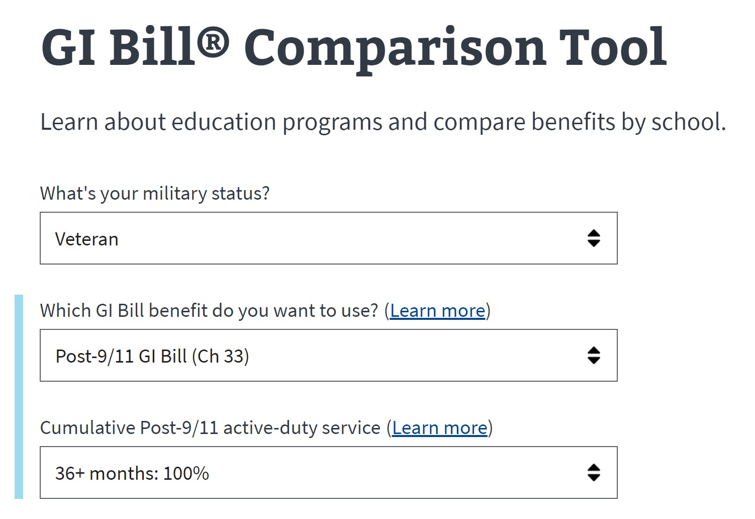 The VA offers their intuitive GI Bill® Comparison Tool to help you evaluate programs and compare how your benefits can be used at U.S. schools by entering the school name or your zip code.