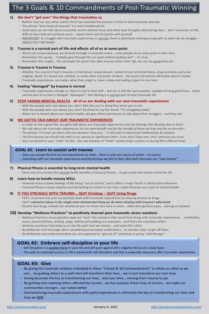 The Post-Traumatic Winning program, which is separate from his radio program, comes with three goals and 10 commandments: