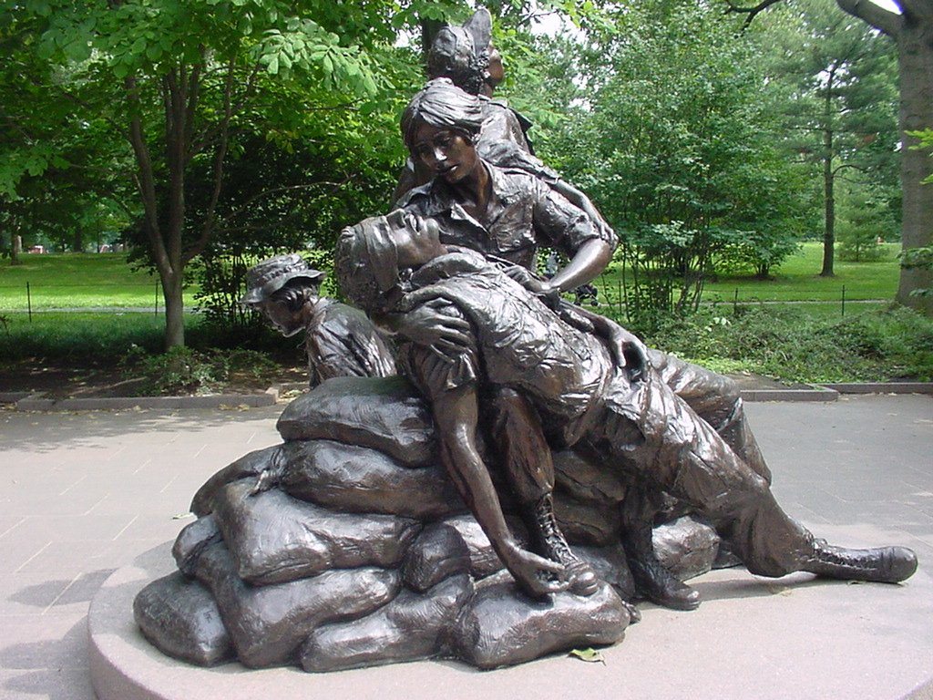 Carlson Evans describes the monument as, ” … an injured soldier being cradled by a female nurse, a standing woman looking to the sky as if for a medical evacuation helicopter or even perhaps divine help from God, and an anguished kneeling woman who is holding an empty helmet.”