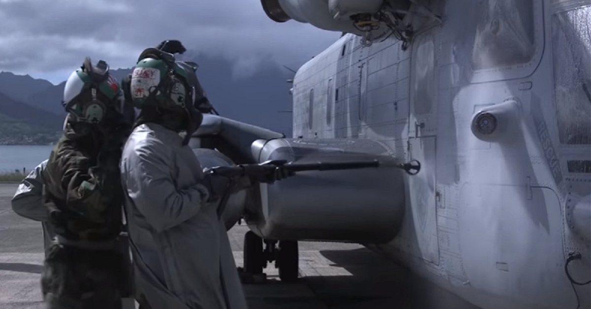 You can see some Marines practice their decontamination drills on the chassis of an old helicopter in the video below. Note the protective gear.