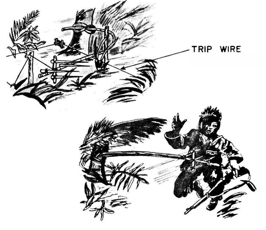 They were often marked by the Viet Cong using broken bushes, palm leaves, or certain alignments of sticks, such as a rectangle or tripod. The retreating Vietnamese would fashion traps from crude spikes, grenades, wires, and even memorabilia.