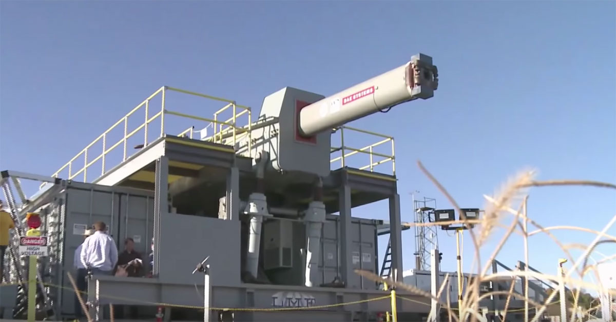 The two parallel rods — considered the weapon’s barrel — are connected to a power source which sends an electrical current through the rails generating a powerful magnetic field.
