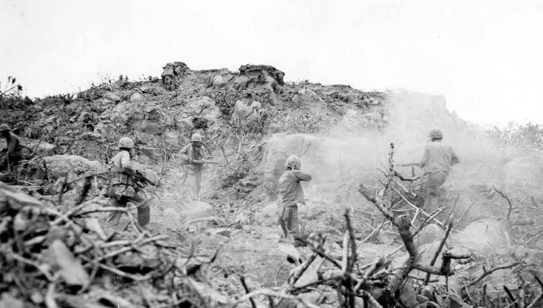 Under the guidance of a Marine officer, he was given a few riflemen for protection as he dashed toward the Japanese stronghold to burn them out of their position.