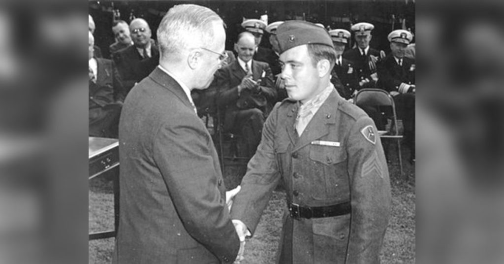 On Oct. 5, 1945, Hershel Woodrow “Woody” Williams was presented with the Medal of Honor by President Truman.